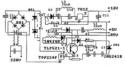 交流电源电压经BR1整流和C1滤波后,产生高压直流电压加至变压器T1和初级线圈一端,变压器初级线圈另一端接TOP224P。用VR1和D1来箝位变压器漏电感引脚的脉冲前沿尖峰。通过D3、C9、L3、C10整流滤波,再由7812稳压块进行稳压后,直接得到+12V输出电压。变压器次级线圈通过D2、C2、L1、C3整流滤波后,产生+5V直流输出电压。R2、VR2组成一稳压电路,提高负载调整能力。次级线圈T1-4两端电压经D4、C4整流滤波,提供TOP224P所需的偏置电压。L2、G、C8可以减弱由变压器原端线圈和原端到副端等效容性阻抗产生的高压开关波形引起的共模电流。L2、C6组成电磁干扰滤波器,减弱由变压器原端梯形电流的基波和高次谐波干扰产生的差模电流。C5、R3与控制端阻抗ZC设置自启动周期。